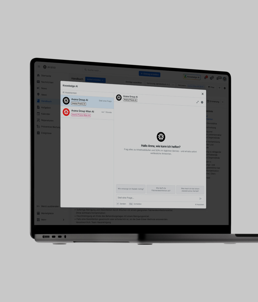 Er hilft deinem Team, Informationen aus dem digitalen QM-Handbuch schnell zu finden und zu verstehen – über eine einfache, dialogbasierte Abfrage. Knowledge AI nutzt ausschließlich die Inhalte, die du in medikit dokumentiert hast.